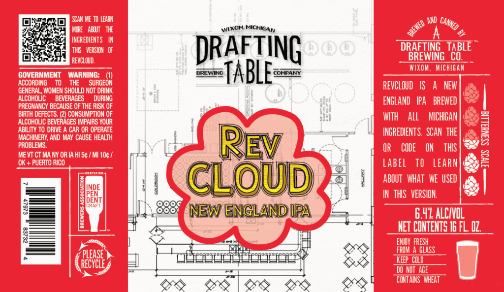 revCloud is a New England IPA brewed with Michigan hops and malt. The Michigan ingredients change batch to batch. Check them out below.